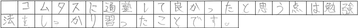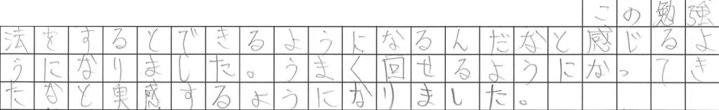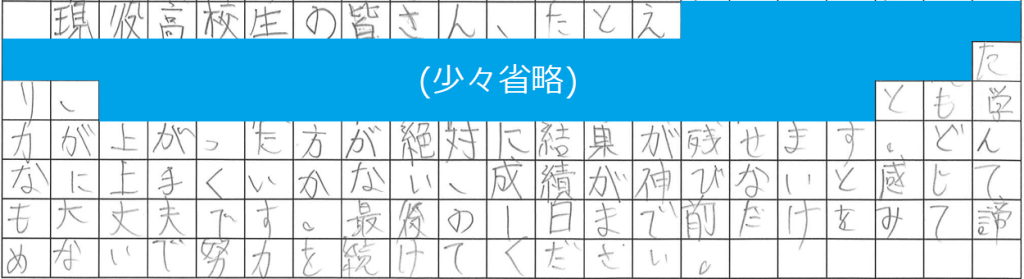 ちょっと公表をためらうような部分がありまして、そこは省略させていただいておりますが、ともかくすぐには上手くいかないと思っても、正しい方法で勉強を続けることによって学力が上がるよ、そしてその方が絶対に結果が残せますよ・・・ということを力強く書き残してくれました。