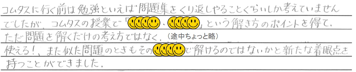 この卒業生は鳥取大学に進学したM.K君ですが、コムタスに来る前は「ひたすら問題を解きまくる」という勉強方法を取っていたんだそうです。でもその勉強方法には不足していたものがあった、ということですね。